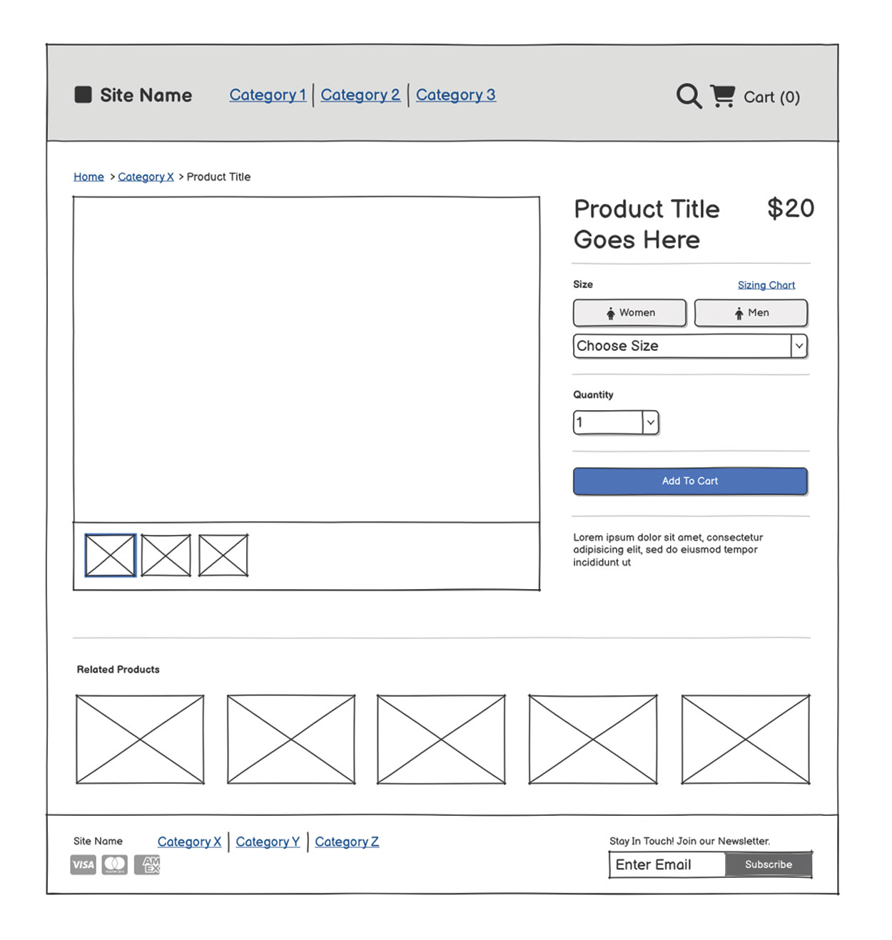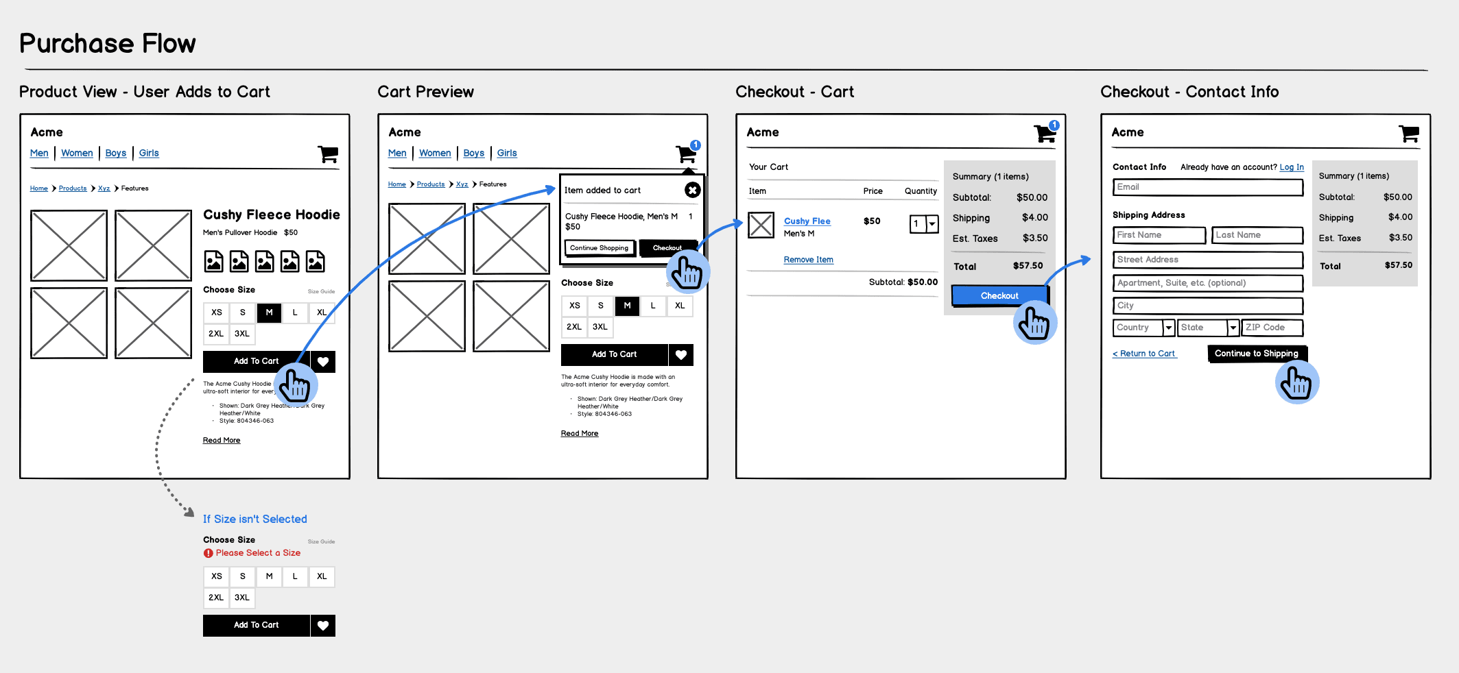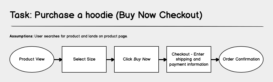 Next, start thinking about the key screens in your interface. A helpful way to do this is by identifying the starting and ending points of a task. In the “buy a hoodie” example, the starting point might be a product page, and the ending point is the order confirmation screen.