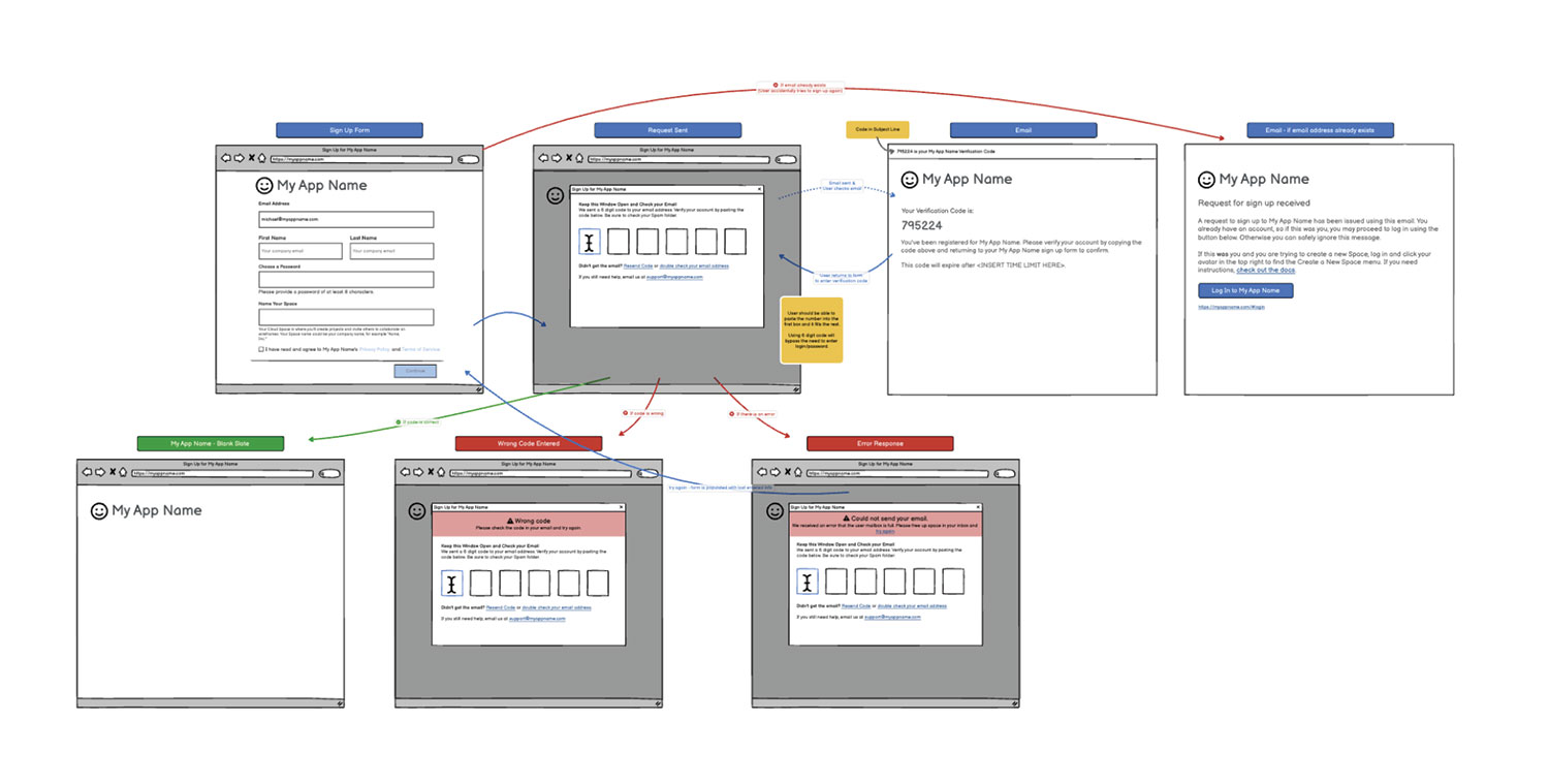 This wireflow shows how a user verifies their identity after signing up, including entering a code, resending a verification email, and recovering from common errors like using an already-registered address or entering the wrong code.