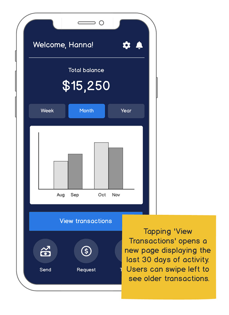 A navigation annotation could clarify: “Tapping 'View Transactions' opens a new page displaying the last 30 days of activity. Users can swipe left to see older transactions.”
