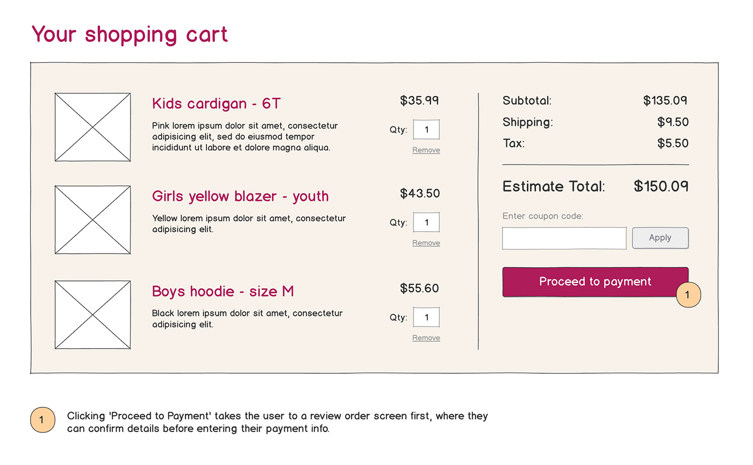 A user flow annotation could explain: “Clicking 'Proceed to Payment' takes the user to a review order screen first, where they can confirm details before entering their payment info.”