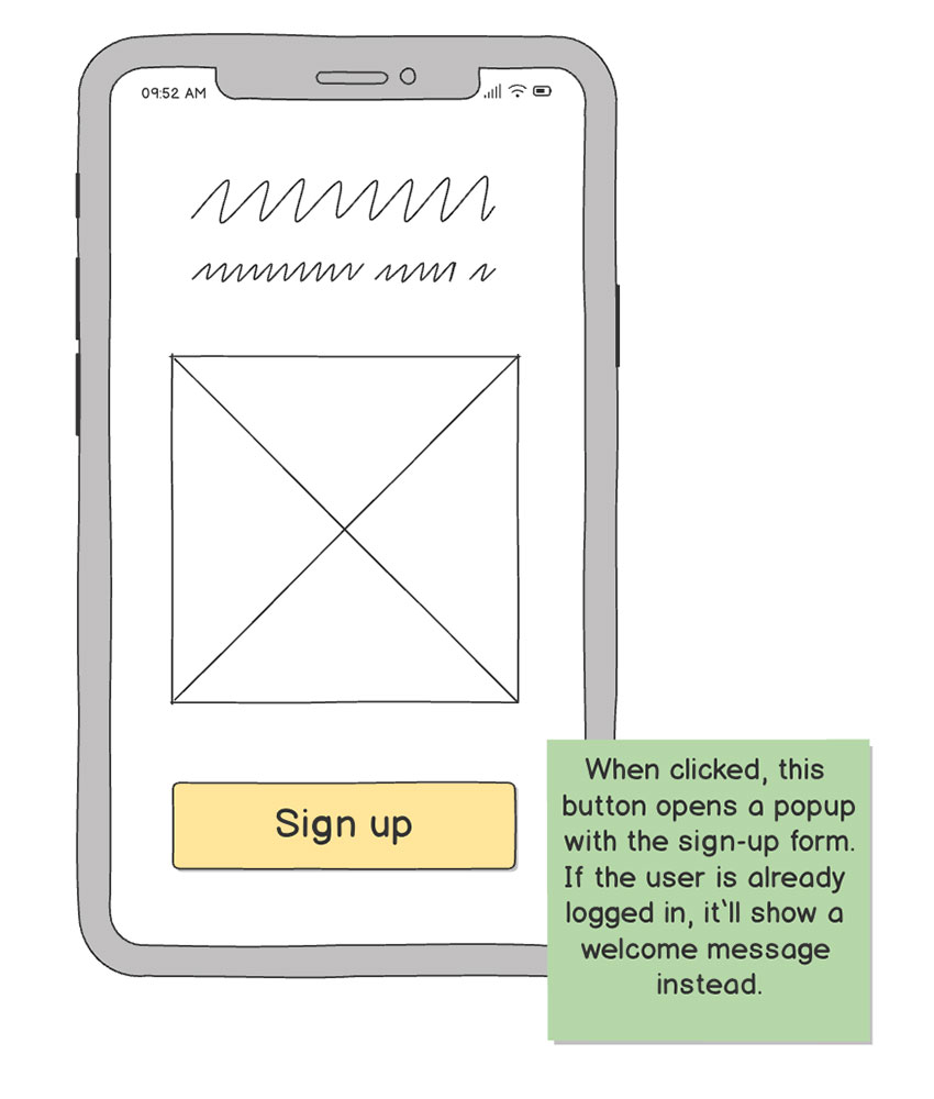 A design annotation would clarify that: “When clicked, this button opens a popup with the sign-up form. If the user is already logged in, it’ll show a welcome message instead.”