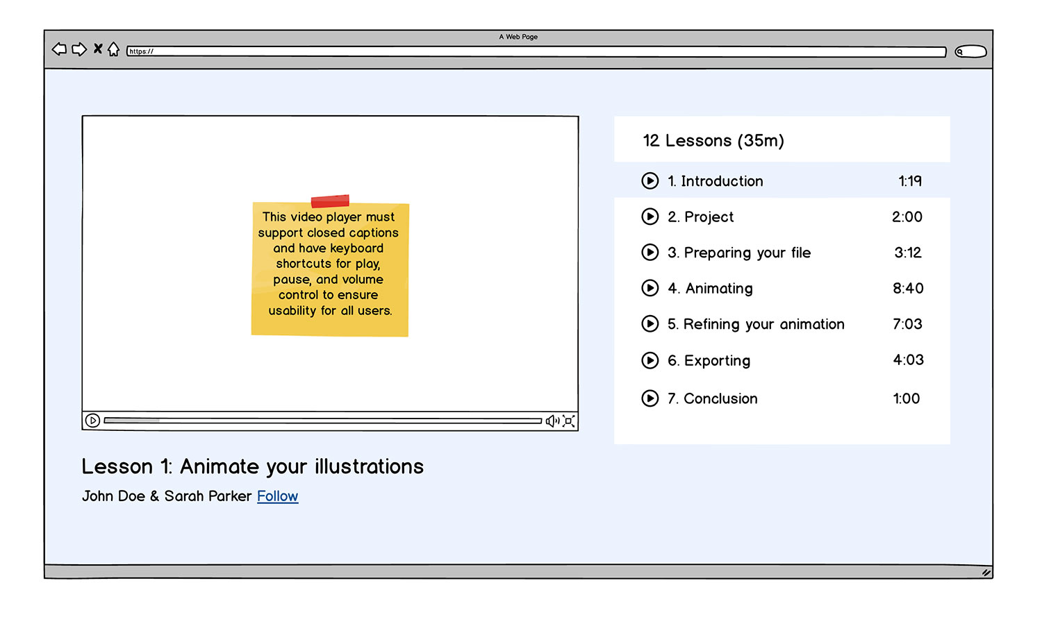 An accessibility annotation could clarify: “This video player must support closed captions and have keyboard shortcuts for play, pause, and volume control to ensure usability for all users.”