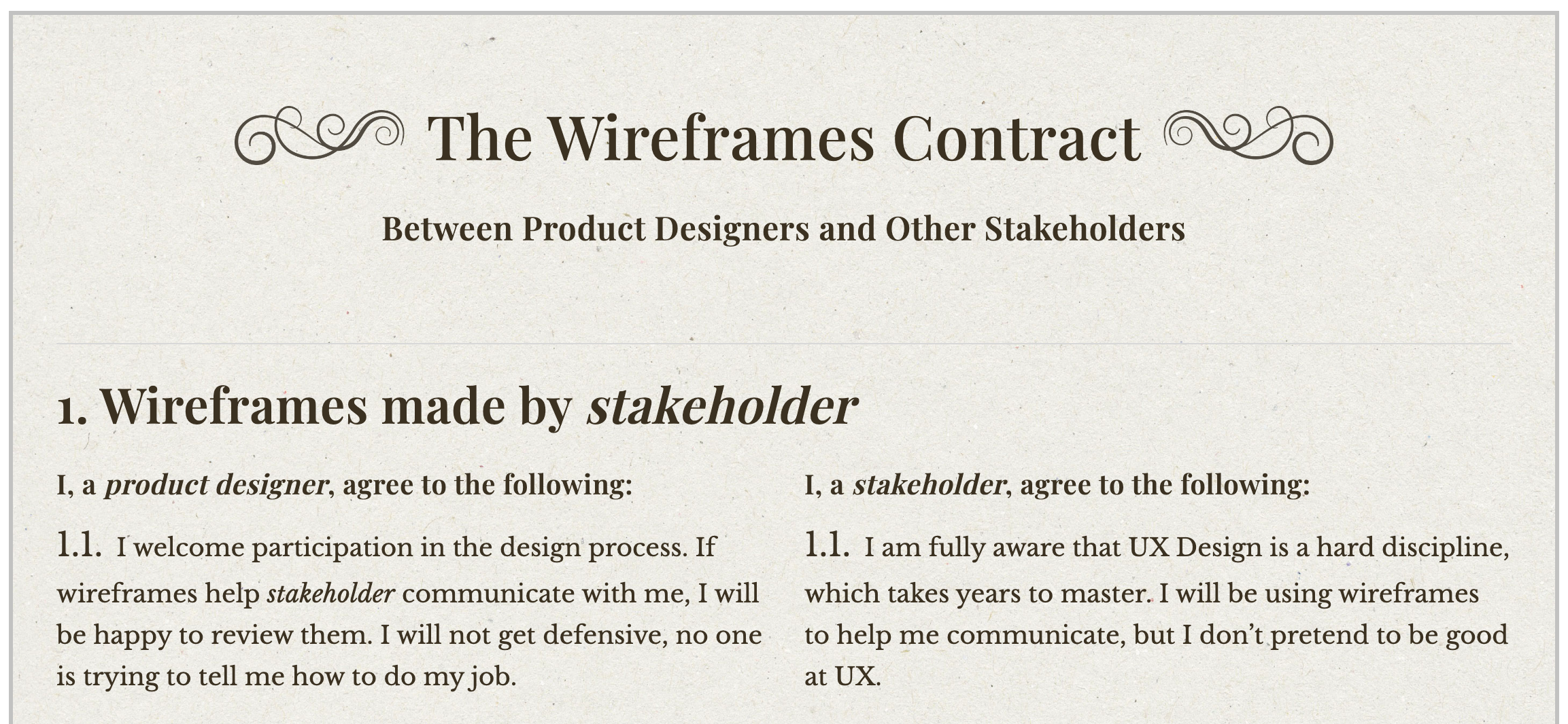 Instead, we have come up with a set of ground rules that will turn this potentially frustrating interaction into a smooth, efficient, and collaborative relationship. We called it “The Wireframes Contract” and it applies to anyone with an idea.