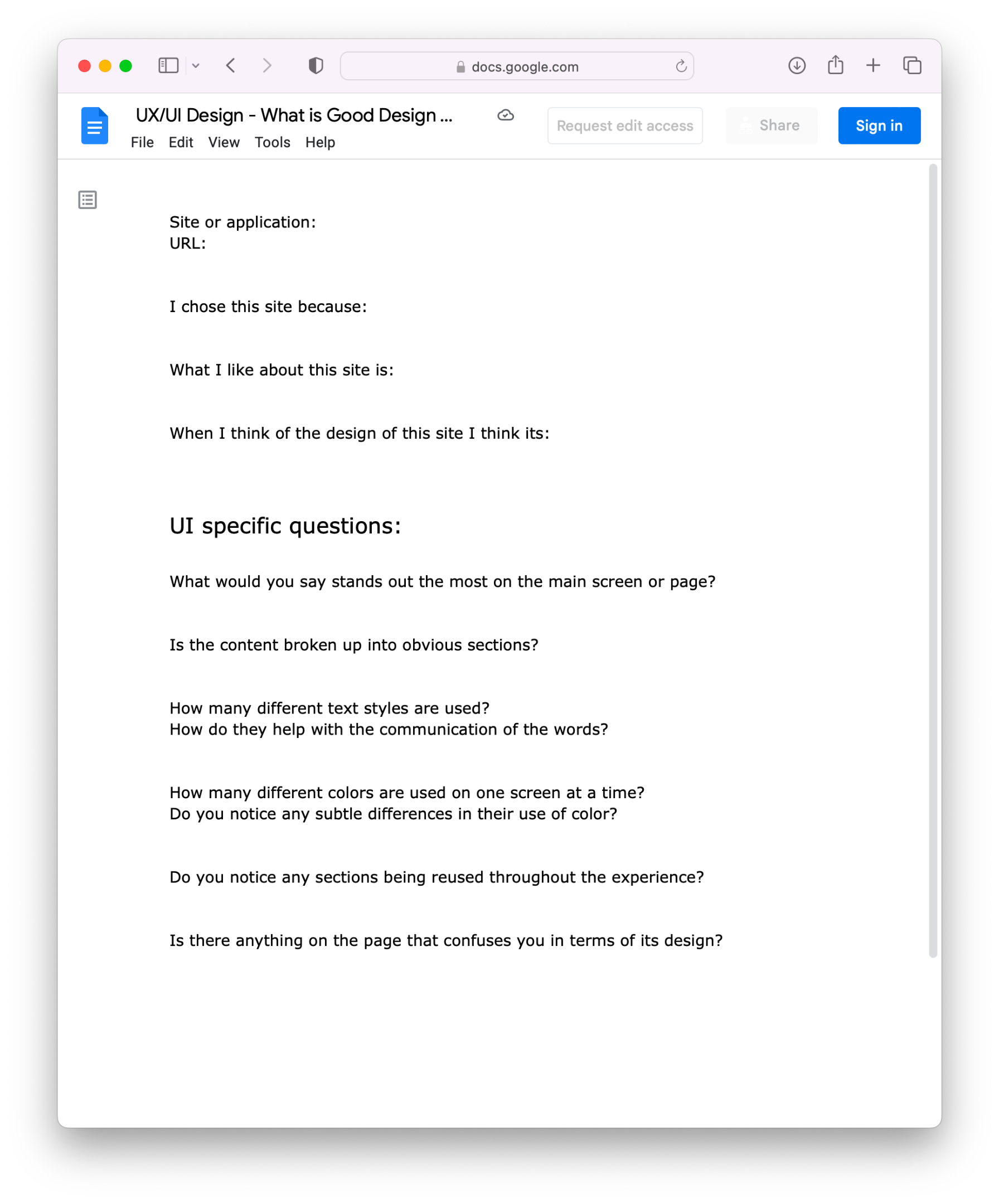 These are very broad and subjective answers. I want them to dig deeper. What do you notice about the colors used? How do imagery and typography work together? What is the most prominent thing on the page? What makes it prominent? How do the elements on the screen work together to achieve this? I want my students to not only see the details in the UI, but communicate those details in well-defined terms.