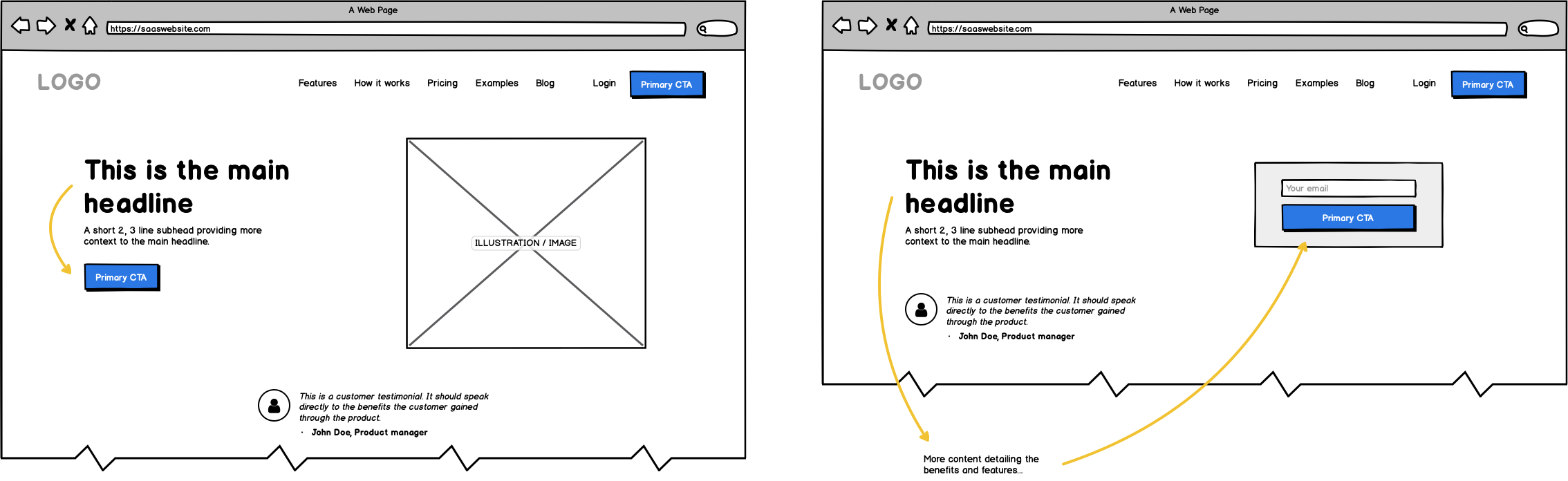 Finally make sure the path to signing up is clear by differentiating your CTA buttons into primary and secondary. Primary buttons should reflect the goal of the page (usually to sign up or get in touch), while secondary should give users a way to learn more about what they’re reading.