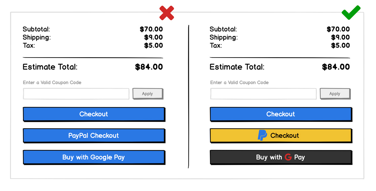 When displaying your checkout buttons, remember that you’ll already have an established pattern for primary buttons, use it! The other payment options may compete with it visually; make sure they have their brands associated with them to avoid confusion. Your button is associated with your brand. The user will be able to understand this and choose whichever option suits them best.