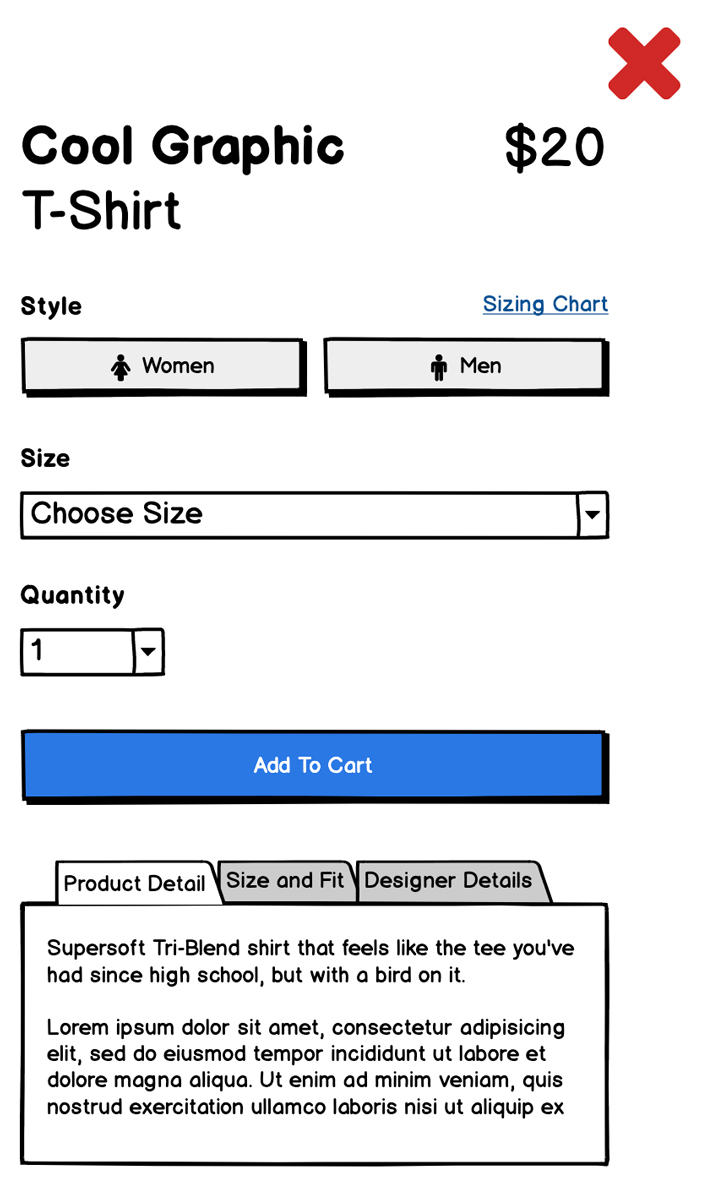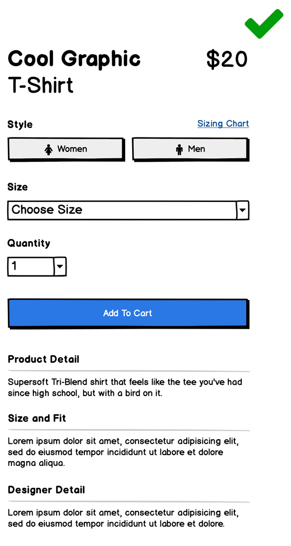 Proper hierarchy and alignment will create easy-to-scan pages of products and information throughout the experience. Following established patterns in your product pages and not hiding product information will allow users to find any details they may need to make the decision to purchase.