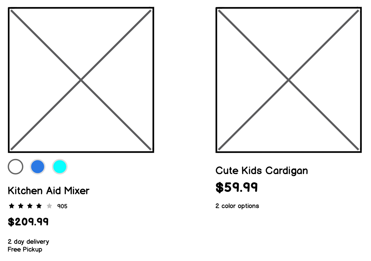 To be successful, product cards need to highlight a few things: a thumbnail image of the product, the name/title, and the price.