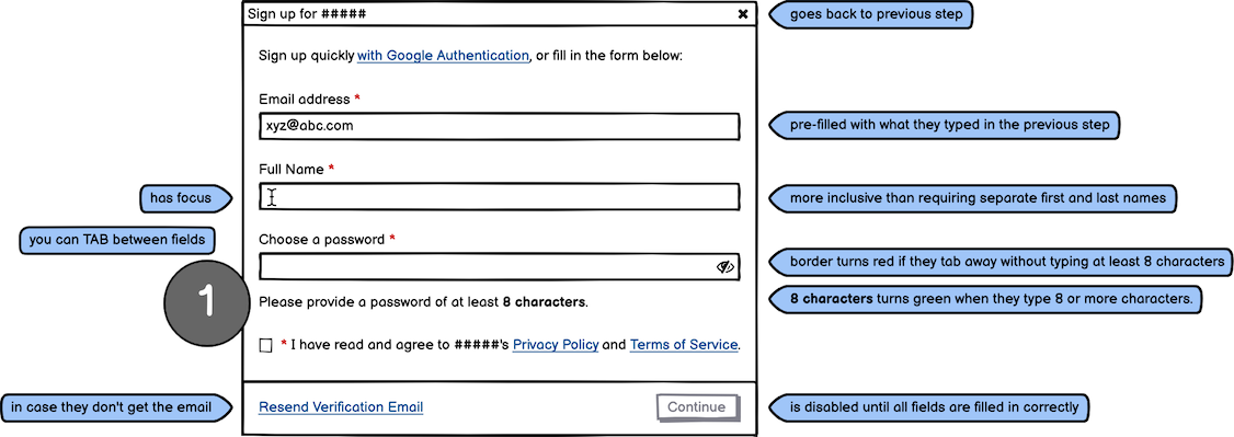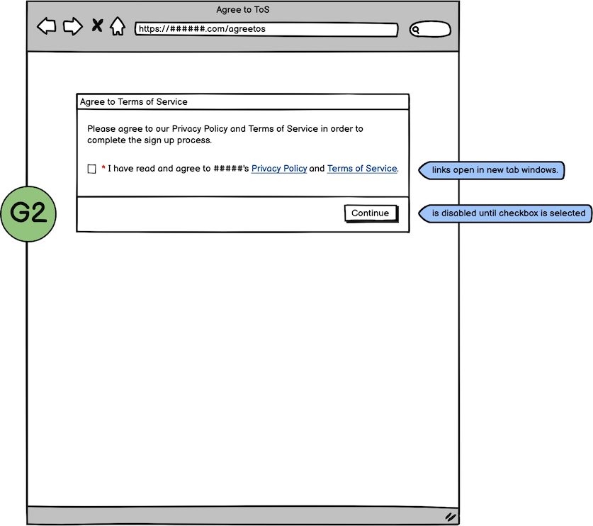 - Remember to show the standard Privacy Policy and Terms of Service checkbox. The links should open in new browser tabs, so that they don't interrupt the sign-up flow.