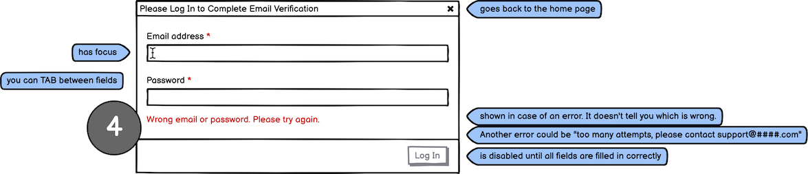 - There is space in the form for errors: the classic one is "Wrong email or password. Please try again." which intentionally doesn't tell them which of the 2 fields was wrong. It's a bit annoying as a user, but it prevents information from leaking to potential hackers.