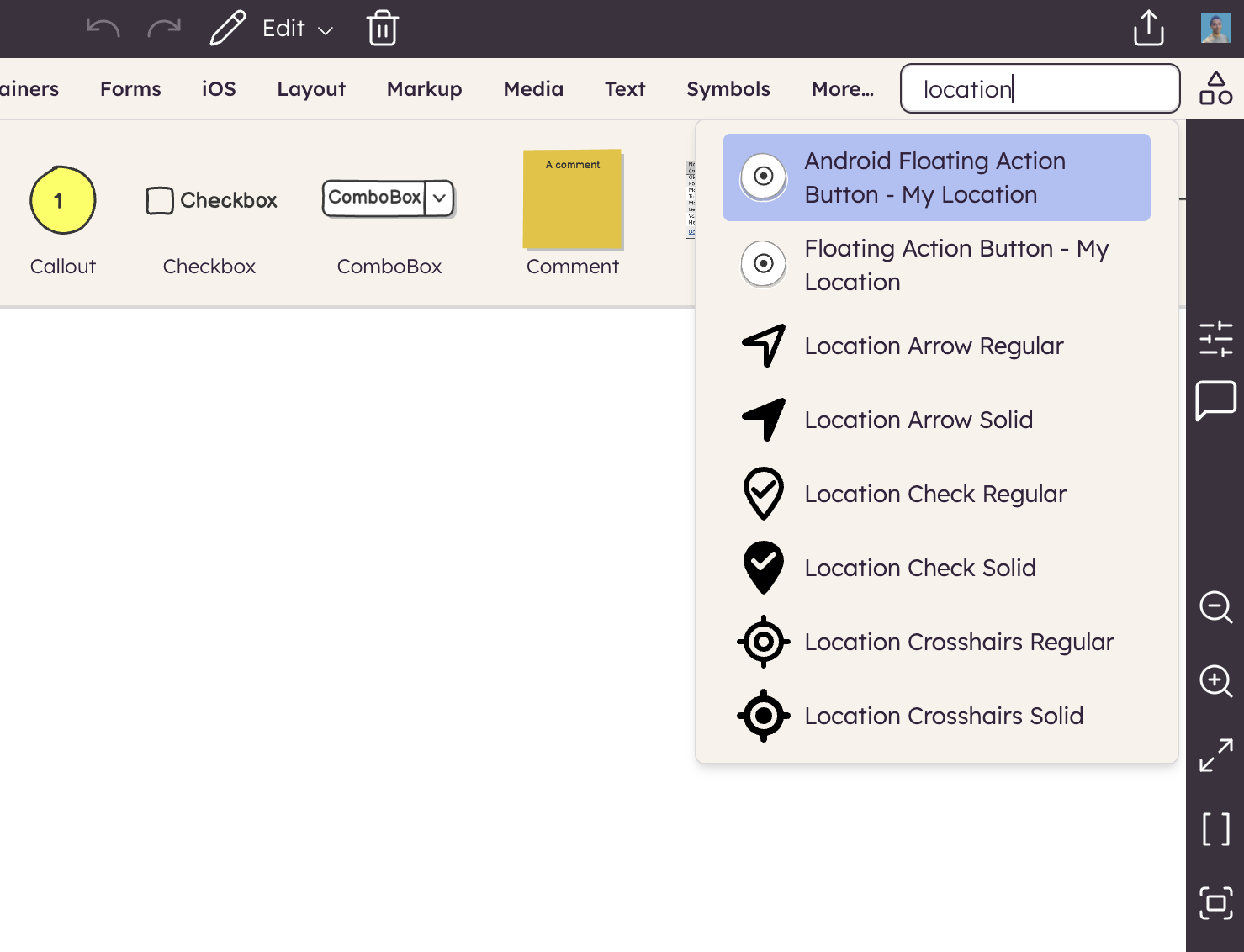 Typing the name of an icon from the icon library displays a list of controls, including matching icons. For example, try typing "location":