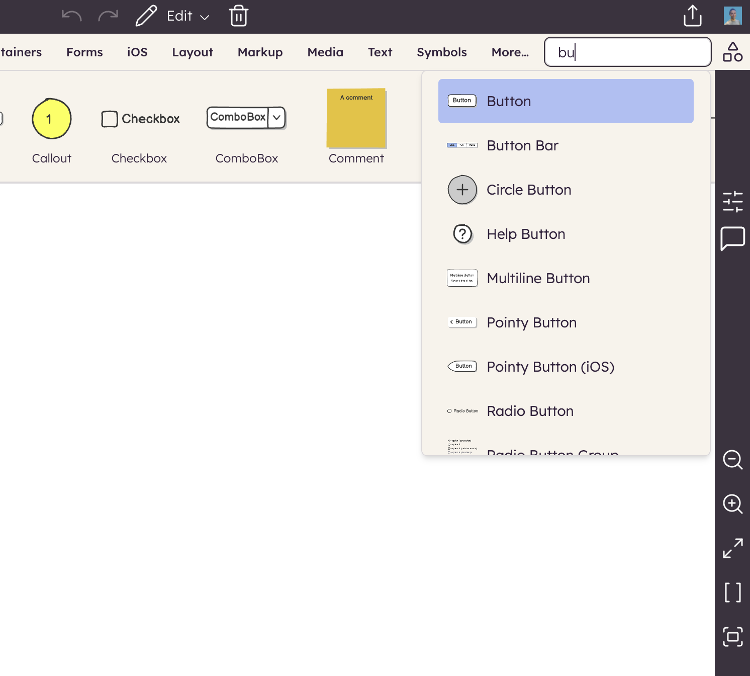 Tip: As you become more familiar, you can hide the UI library and use only search to add elements to your wireframes. This helps to maximize your canvas area.