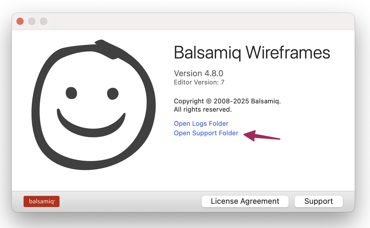 In the event that you cannot open Balsamiq for Desktop, here are actual locations of the Support Folder for various platforms: