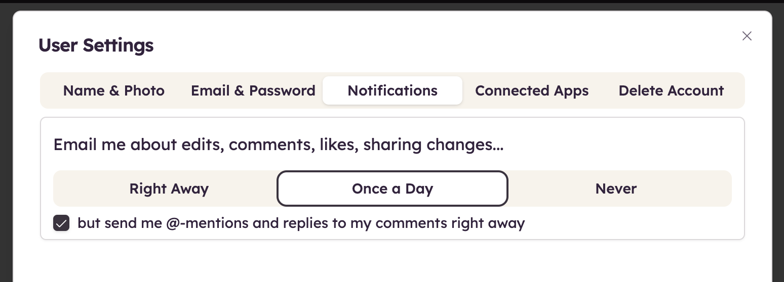 Notifications allow you to be emailed about changes that affect the Space(s) you own or are a member of. Those include edits, comments, likes, sharing changes and more.