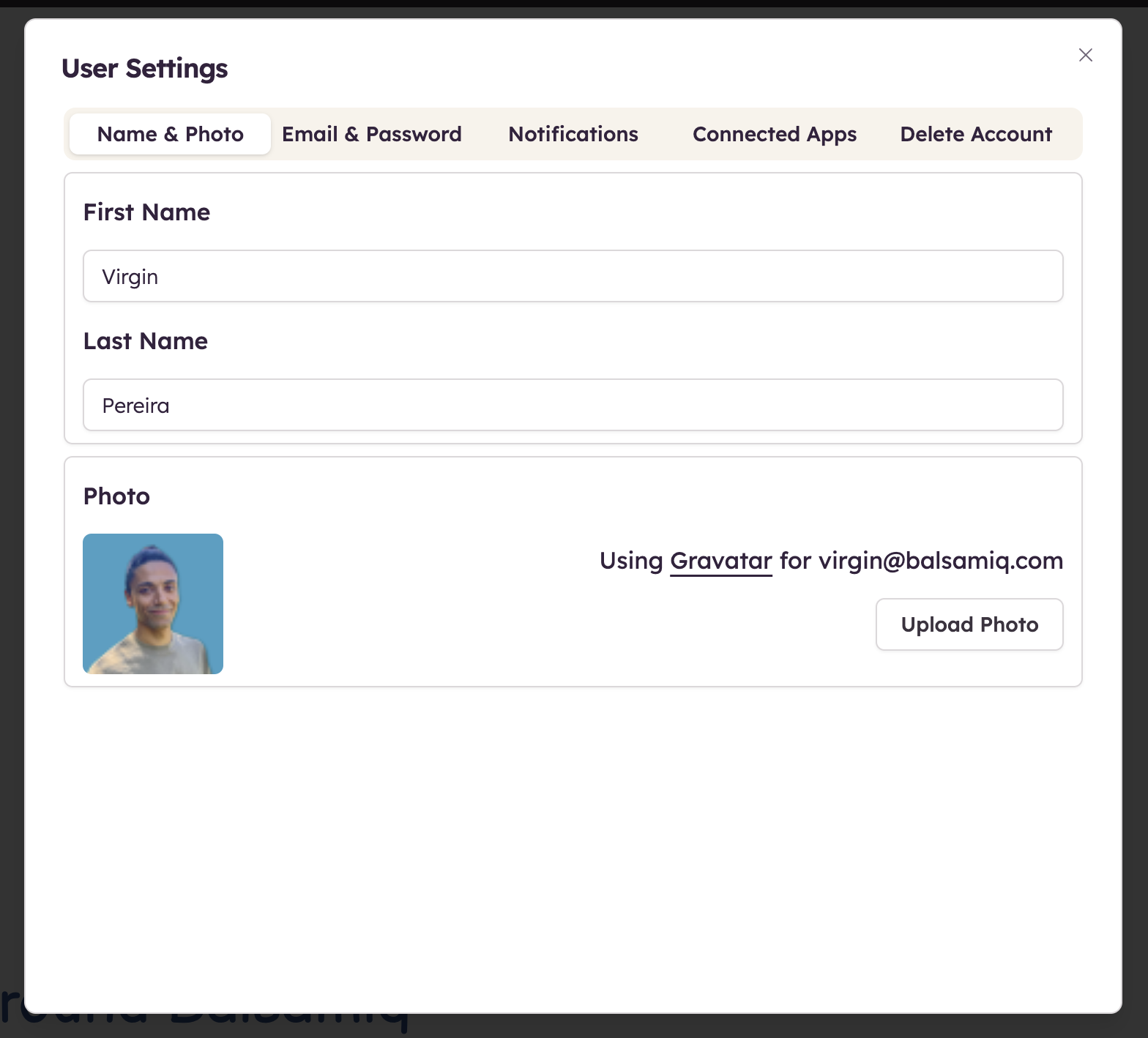 From this dialog, you can change your name and email address, as well as resetting your password if needed.