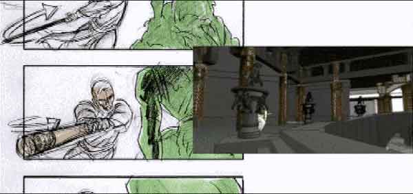 The idea with thumbnail sketching is to draw a smallish representation of your design, roughing out boxes and greeking lines of text to get an idea of what your interface will look like. You actually don't even need text to sketch the interface, just scribbled lines. You can use text captions to describe what's happening in the story.