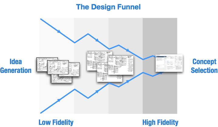 Ideation is a constantly expanding and contracting funnel where you're producing many ideas then selecting and narrowing, and then repeating that process to find the right design. It's a funnel because many ideas become fewer and fewer as you iterate on the ideas that work. The main thing to note is that working at low fidelity at the onset lets you focus on issues at the core of the product, like function and interaction, before thinking about the surface.