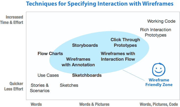 The spectrum of techniques for specifying and communicating interaction ranges from sketching to prototyping. Balsamiq is the sort of tool that sits somewhere across these techniques, and we think it bridges some of the gaps between sketching and wireframing, and only touches prototyping.