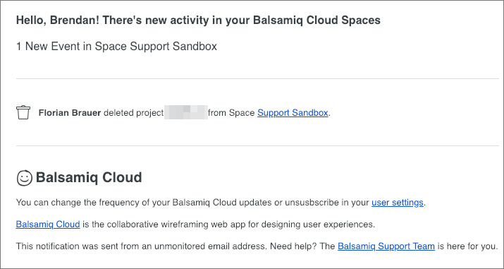 After a long development process (to make sure we got it right), we have rolled out phase one of our Balsamiq Cloud Notification system. That means you now will get email notifications for changes and updates in the Balsamiq Cloud spaces that you are a part of. If you're worried that you may get spammed with updates, don't be! You can make adjustments to the frequency of the emails in your user settings.