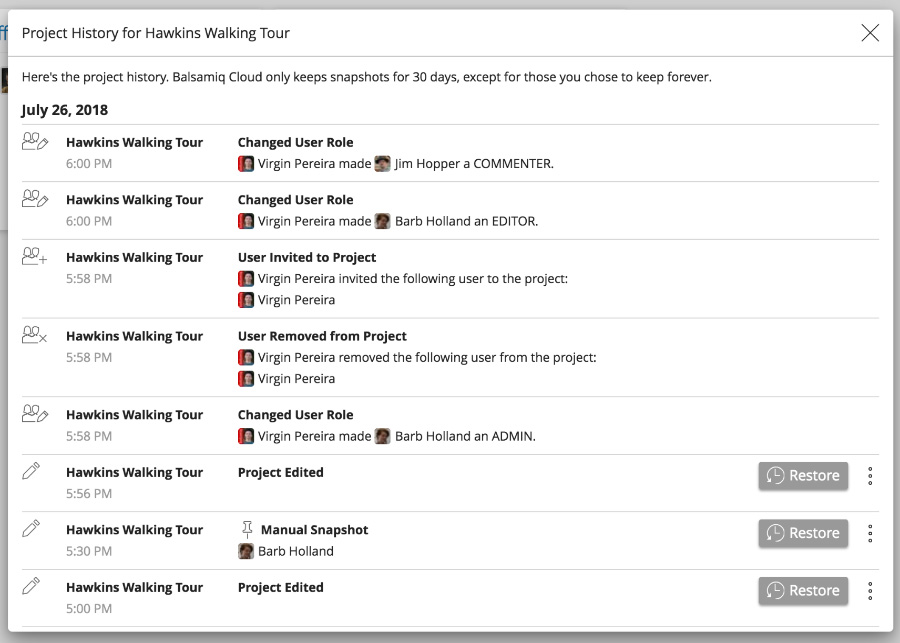 When we launched Balsamiq Cloud last September, we still weren't sure how to best implement project history. We knew we wanted to do it (because it was something our myBalsamiq customers got a lot of use out of) but we still had to figure out how to make it awesome in Cloud. We're really happy we can finally share it with you. You can read more about how Project History works in our documentation.