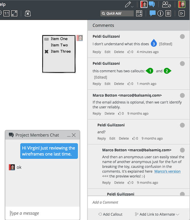 The most important new features are all centered around collaboration. We now have both 'editor' and 'reviewer' roles, built-in threaded comments (with callouts!), real-time co-editing and even a little built-in chat window. Collaborating on your low-fidelity wireframes is SO smooth in Balsamiq Wireframes.