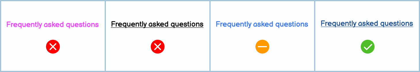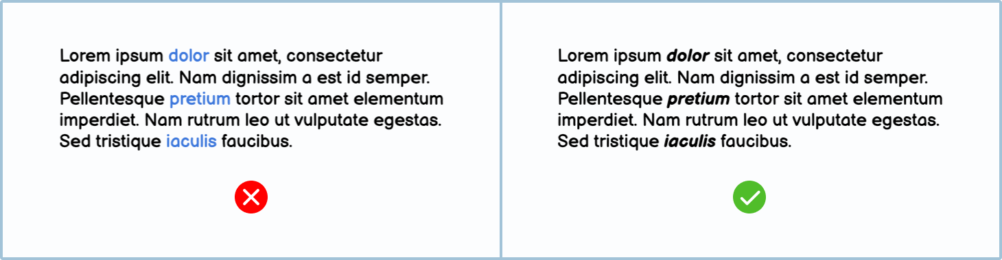 The same goes for coloring text, especially if that color is blue. Use bold or italics to call attention to text instead.