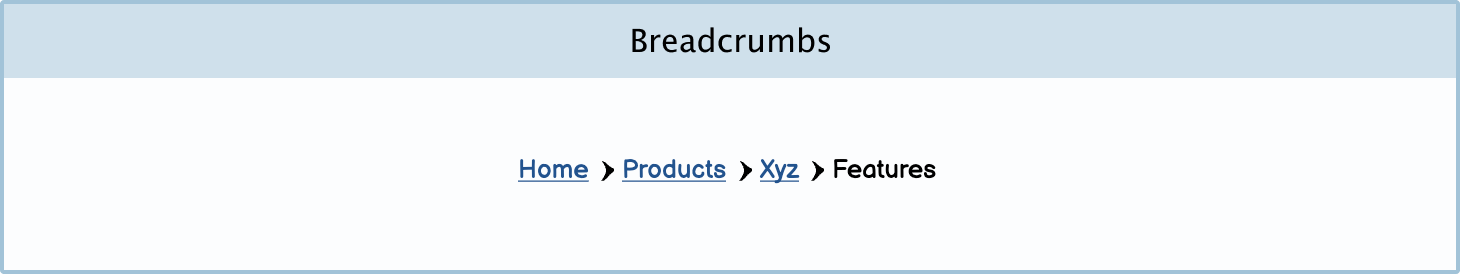 Breadcrumbs: Breadcrumbs let the user know where they are on a site. They should help the user navigate through a page’s hierarchy.