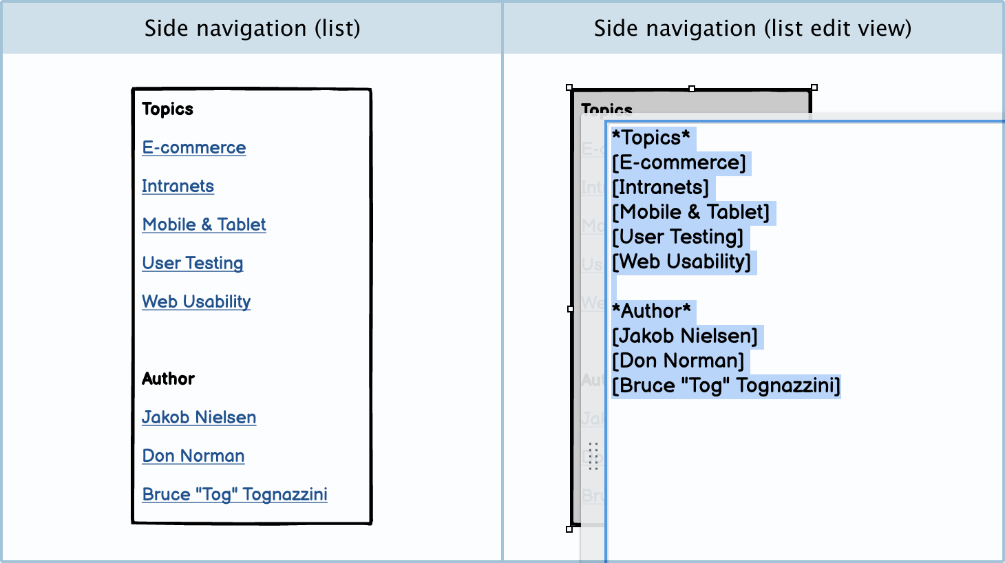 Side navigation: You can create a side navigation symbol using a list control. Make sure to use square brackets around the links so that they’re interactive.