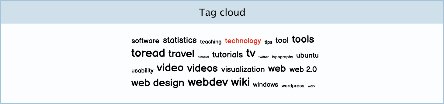 Tag cloud: A tag cloud is a collection of tags found on a website — usually a blog or news site. These individual tags, when clicked, take you to a page with a list of all the posts (or pages) with those tags.