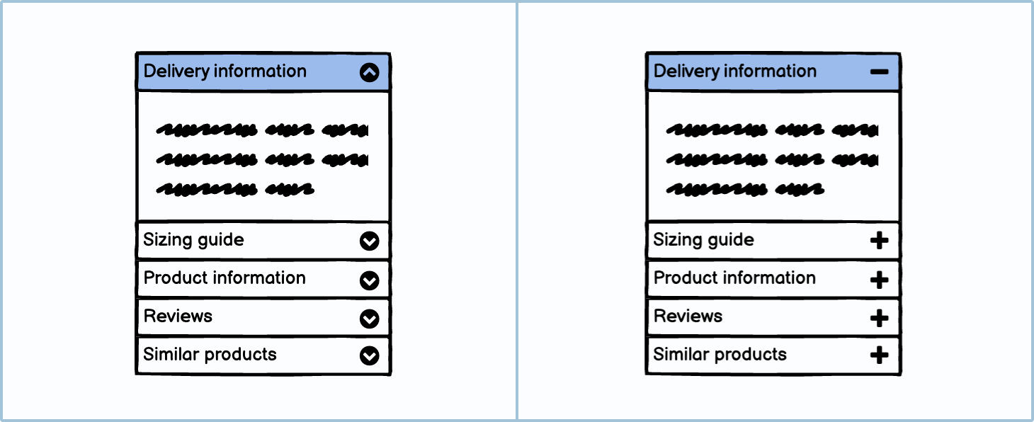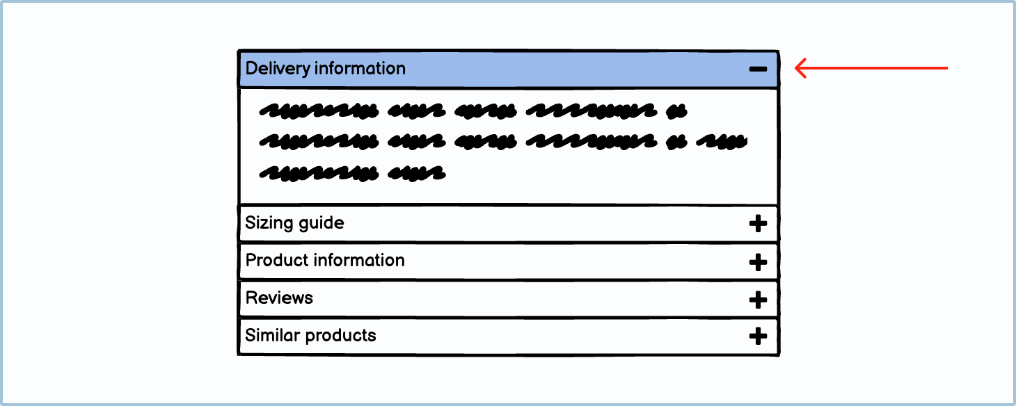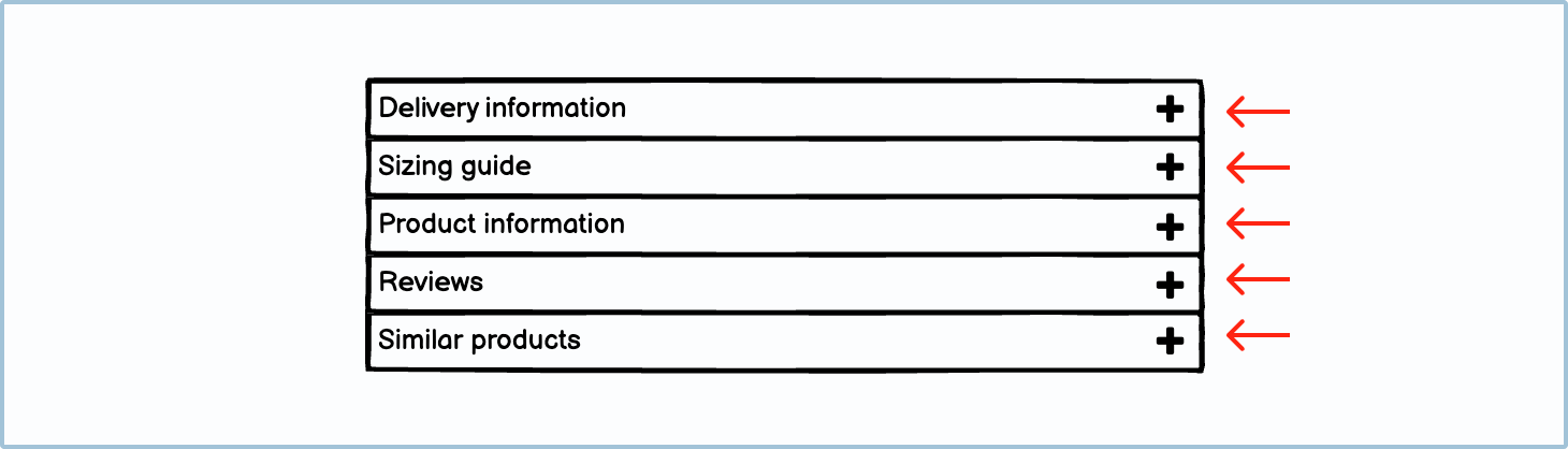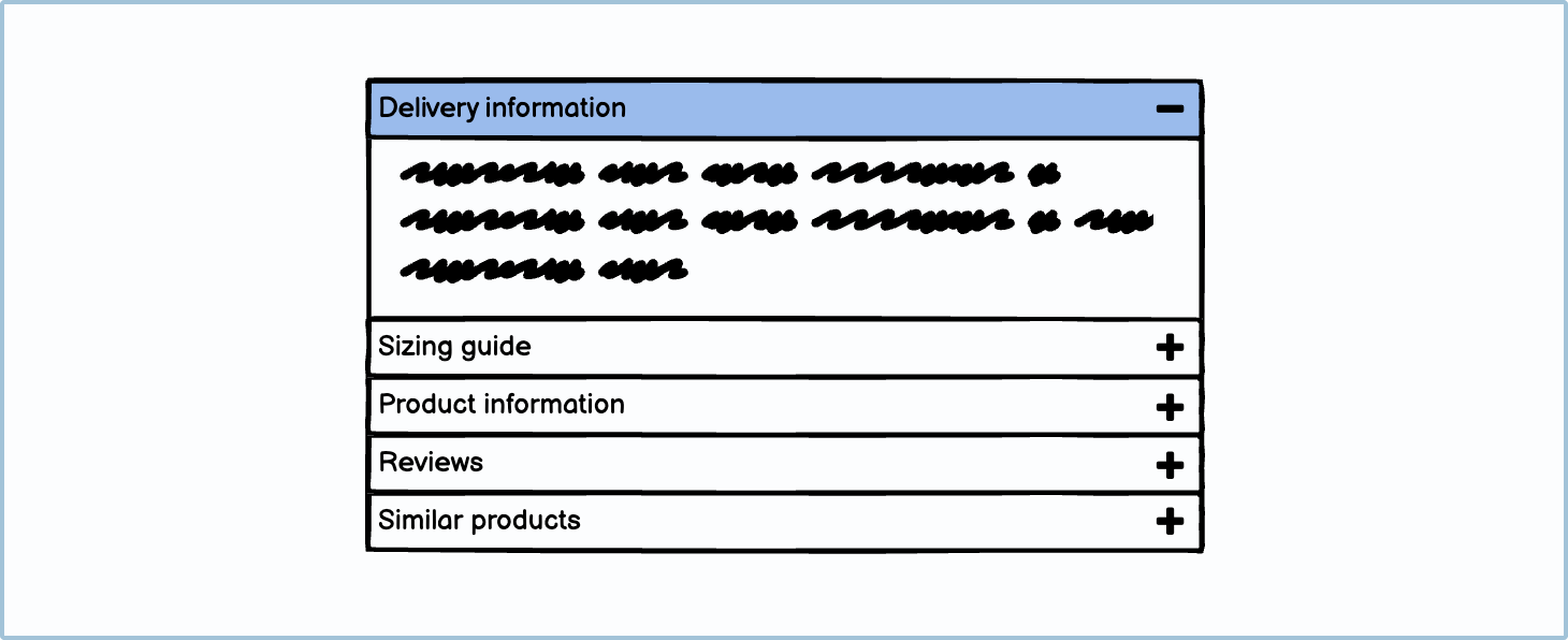 If you are using an accordion to chunk information, only put non-essential information inside. For example, on a product page, you wouldn’t put the price or brand name inside an accordion. You would, however, put the sizing guide, delivery questions, and product materials inside one. If you are using an accordion to chunk information, only put non-essential information inside. For example, on a product page, you wouldn’t put the price or brand name inside an accordion. You would, however, put the sizing guide, delivery questions, and product materials inside one.