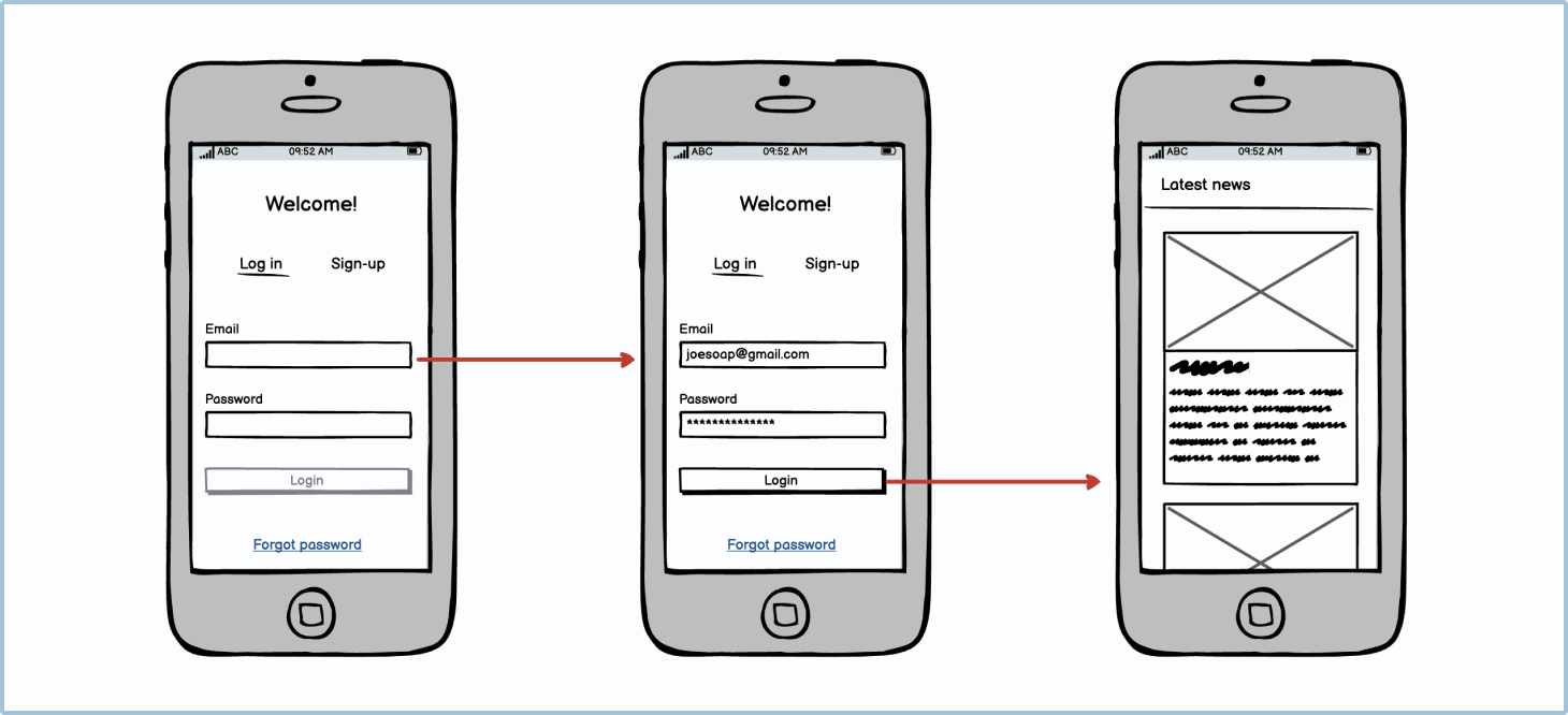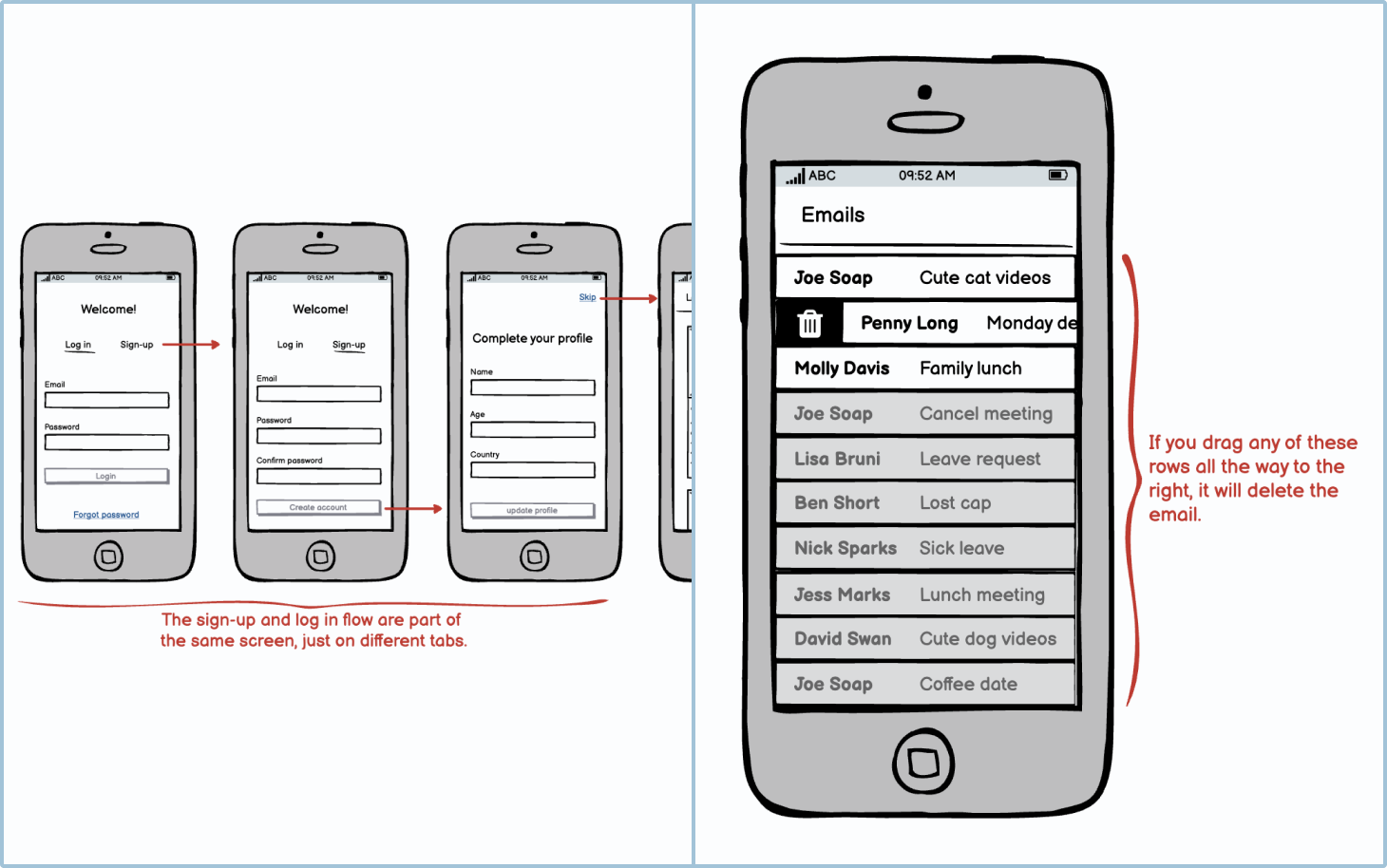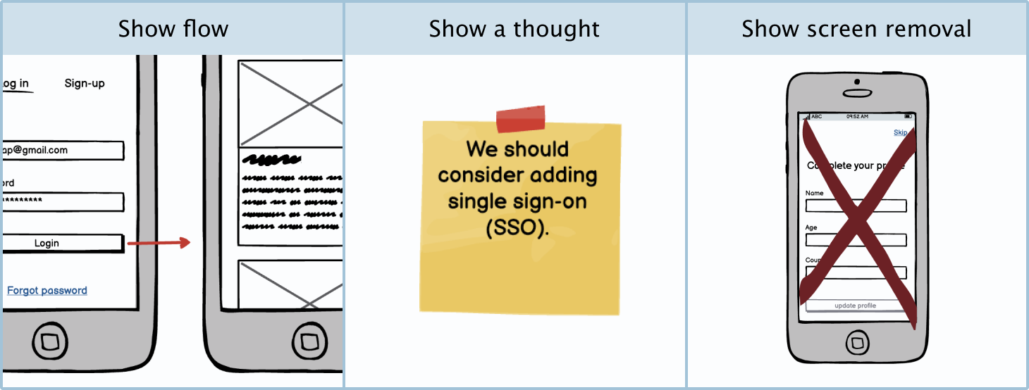 For these richer interactions, it’s always good practice to make it clear in your wireframe what interaction the user would have done to get to the next step in the user flow.