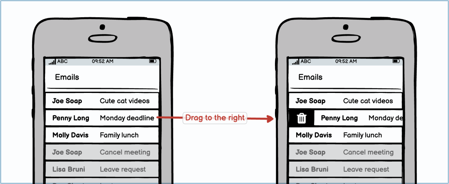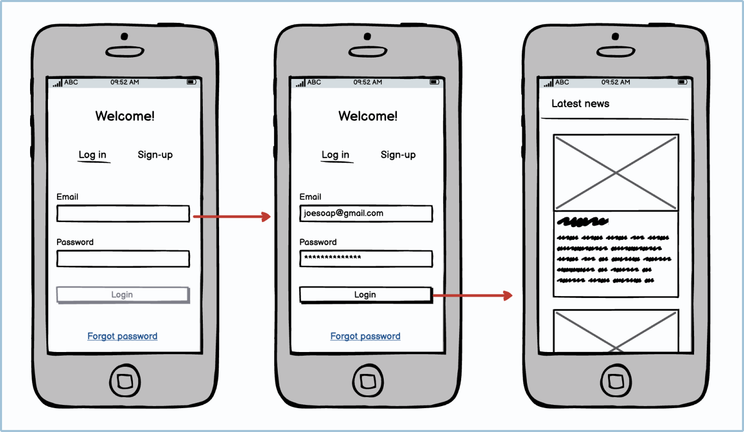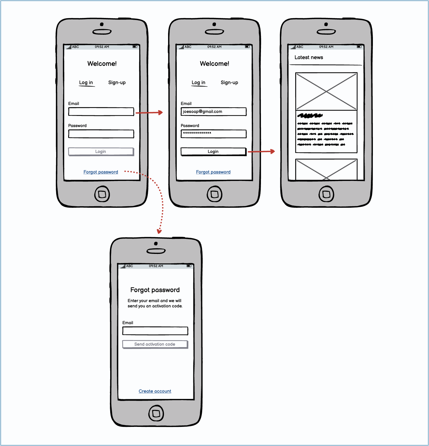 For these richer interactions, it’s always good practice to make it clear in your wireframe what interaction the user would have done to get to the next step in the user flow.