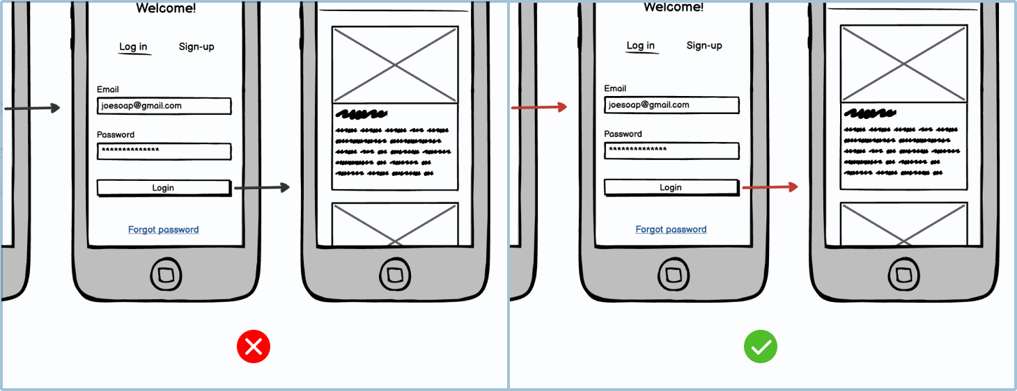 The majority of the time, arrows will be used to show a user journey. It’s best practice to show exactly what the users have clicked or tapped to go to the next step in the user journey. You can do this by making the arrow’s starting point the aforementioned user input.