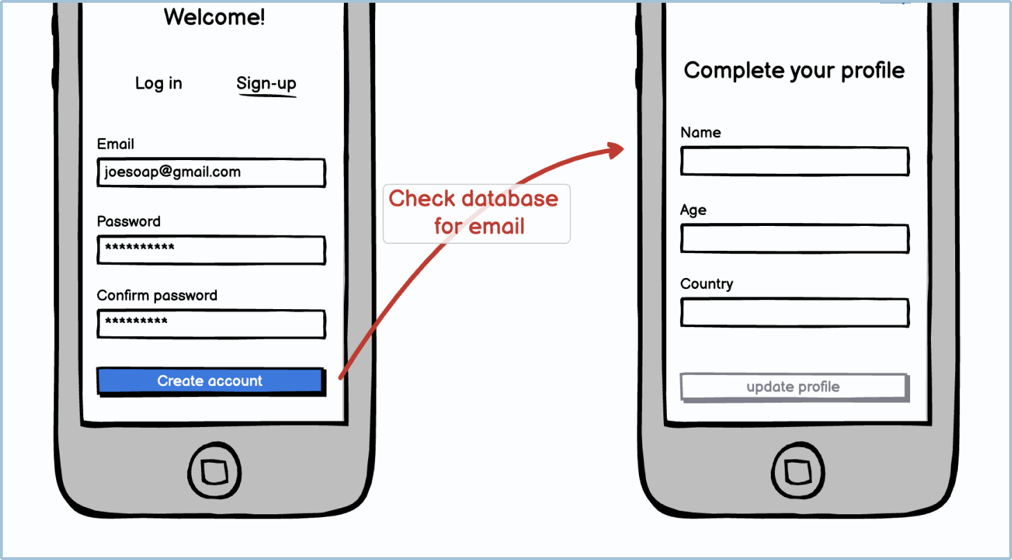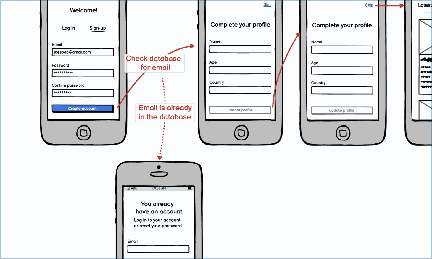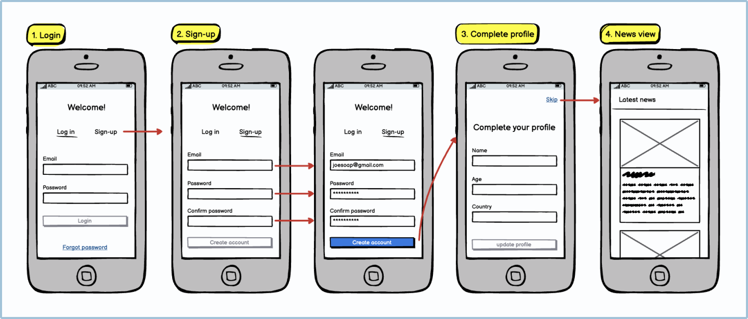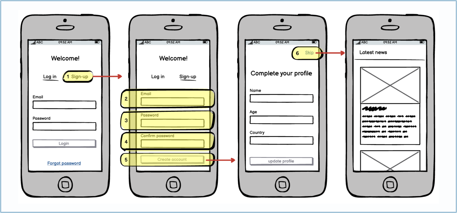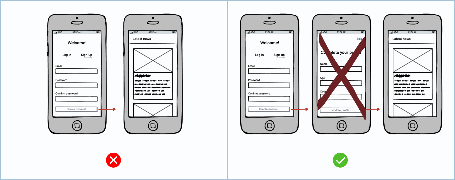 To clarify to the reviewers that you’re removing a screen from the current user journey, you should cross it out rather than remove it. In the example below, the designer wants to remove the “Complete your profile” step. If they just remove it, it isn’t clear what the change is. Whereas crossing it out clearly communicates the desired update.