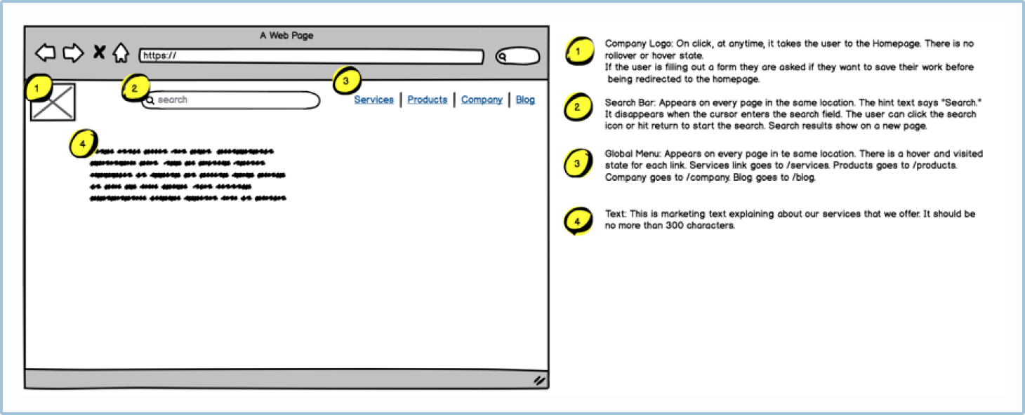 In some wireframes, stakeholders and reviewers may need more information about what’s happening in the design. Callouts can be used to indicate the section on the screen that needs more of a description, and the description itself can be put in a legend or key on the side.