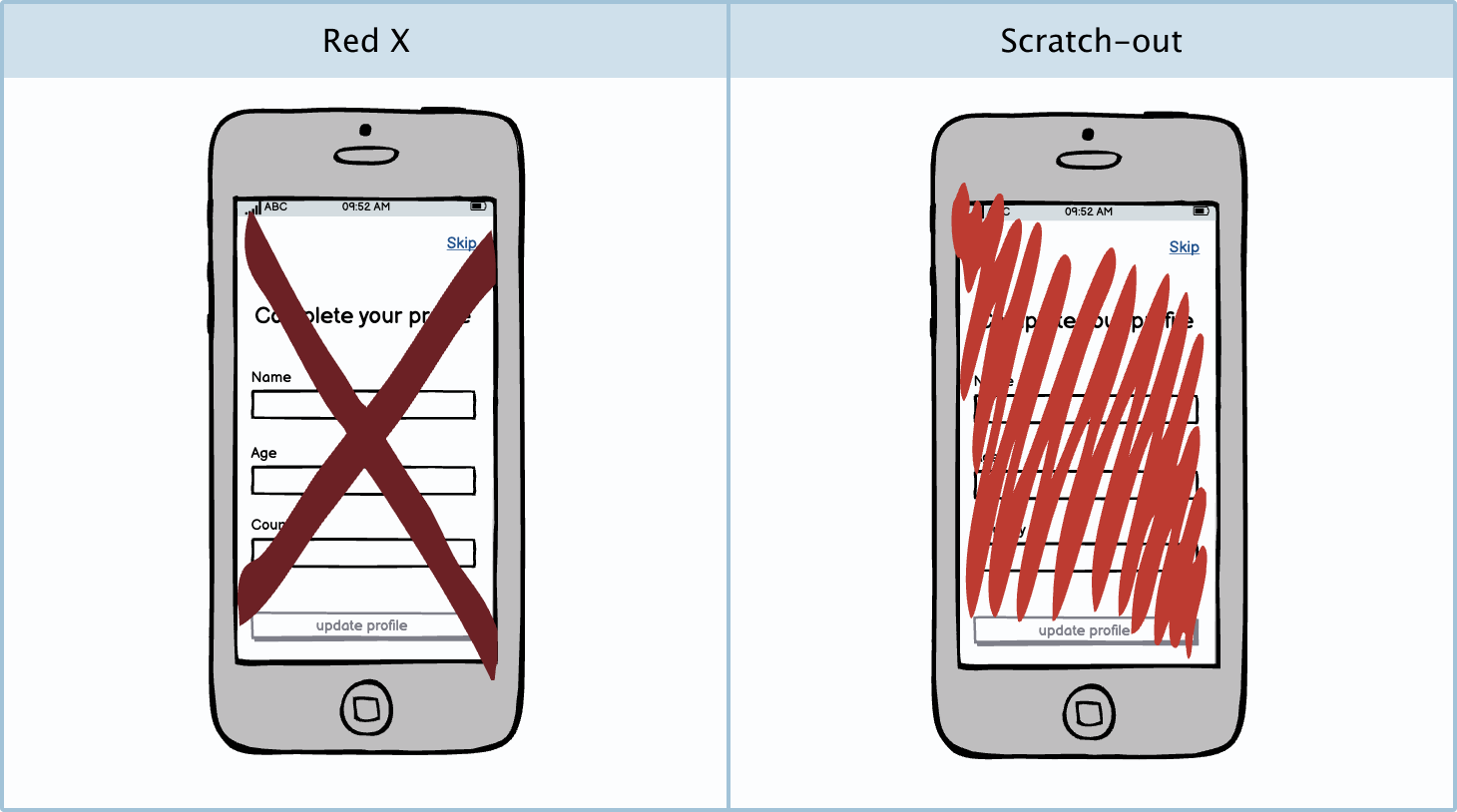 Both the red X and scratch-out can be used interchangeably. However, the red X is better for instances where you want the reviewer and other stakeholders to see what the screen was. The scratch-out, on the other hand, is better at obscuring what is beneath it.