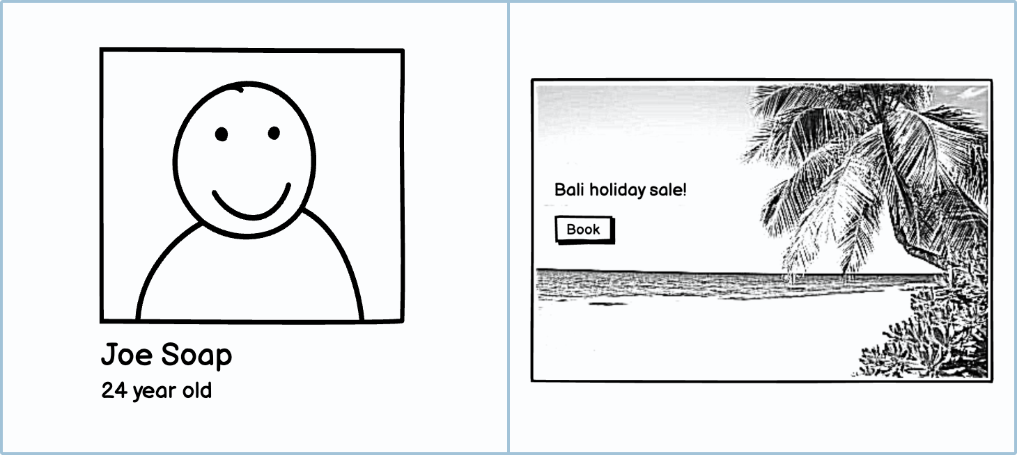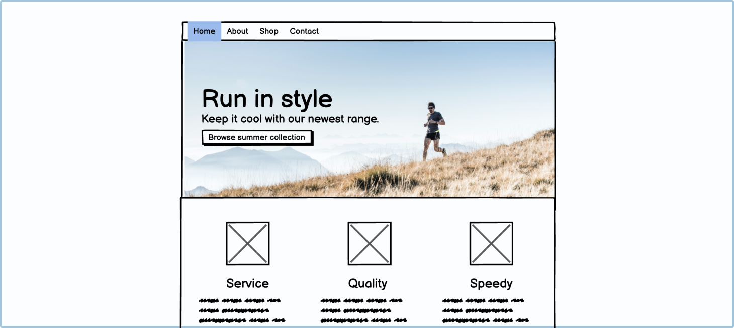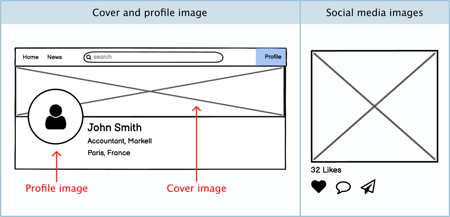 In some wireframes, you need more than a rectangle with a cross through it to describe what you are envisioning. For a user’s profile picture, you may want to have a sketch of a person. For a photography repository, you may want to show what kind of images you are expecting to be there. You may have an idea of an image for the landing page but can't find the perfect one. In these instances, you will want to use a rough sketch to show reviewers what your idea is.