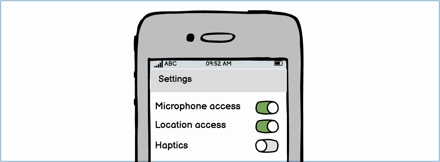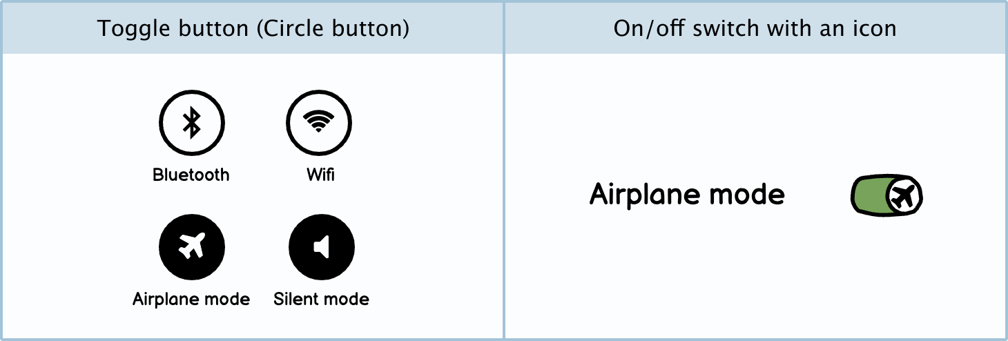 Toggle button: Using a circle button and an icon, you can create a toggle button. The user can click the buttons on and off to set whether they should be active or not. Consider adding labels below, as some users may not understand what the icons mean.