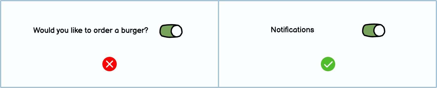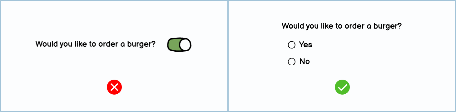 On/off switches are usually used in settings areas and not in forms. If you have a yes/no question that doesn’t relate to settings, use a radio button instead.