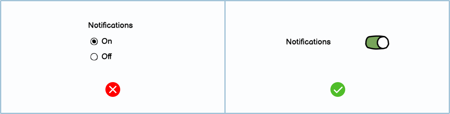 On/off switches are very similar to radio buttons in that they both are single selectors: there can only ever be one option selected. However, unlike radio buttons, an on/off switch can only have 2 options, which usually relate to something being active or inactive.
