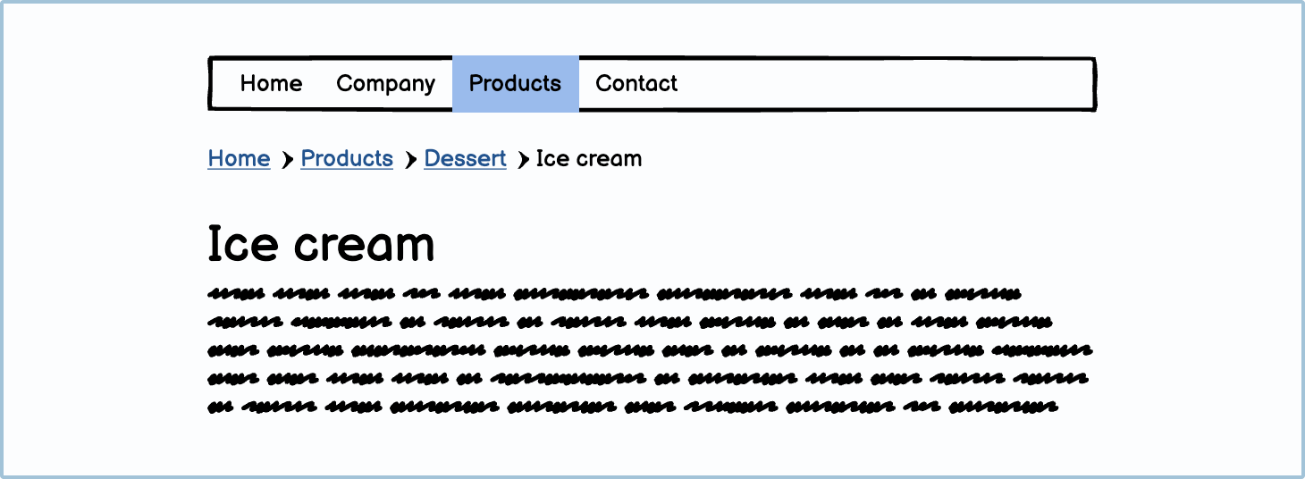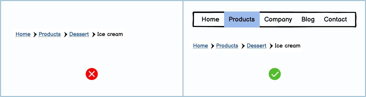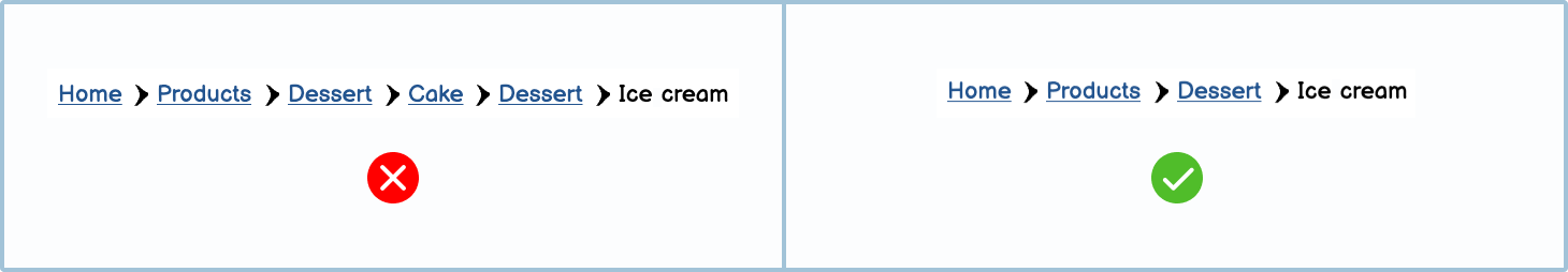 While it can be tempting to show the user’s previous steps in a breadcrumb, this is not the best practice. Breadcrumbs should show website hierarchy.