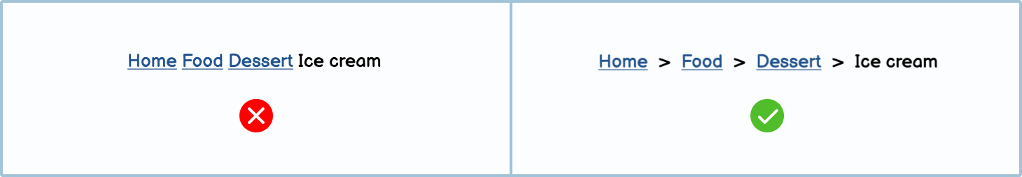 To avoid users getting confused about where the start and end of a link is, always separate them with a special character. The most common are the greater than symbol (>) and the forward slash (/).