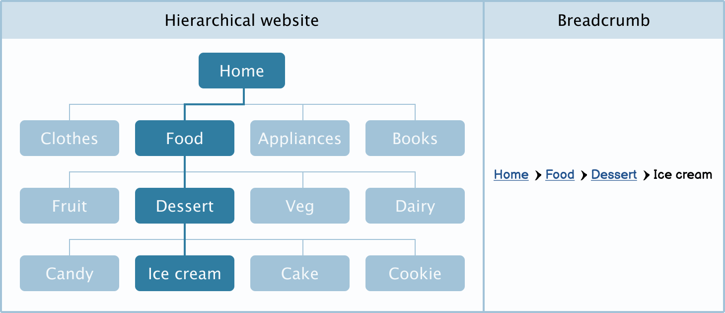 Breadcrumbs are a secondary form of navigation that allows users to navigate a hierarchically structured website.