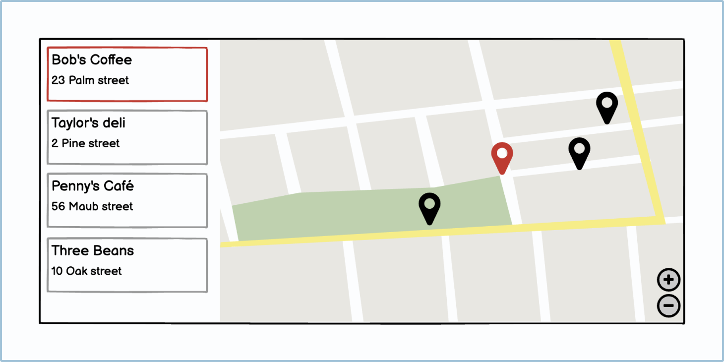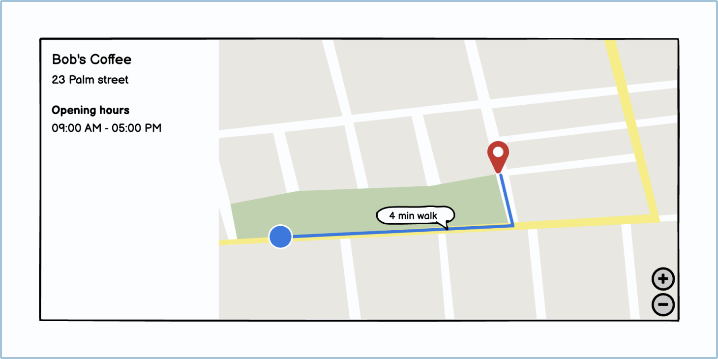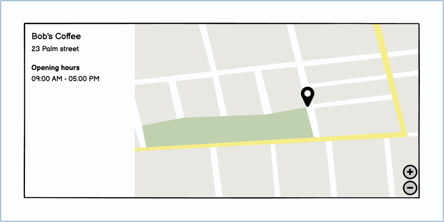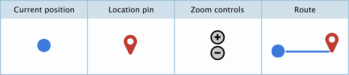 Map with marker: A map with a marker lets the user know where to find a location. You can create your own using a map, circle buttons (for zoom controls), and a map marker icon. You can also add a current position icon (circle) and a route (line).