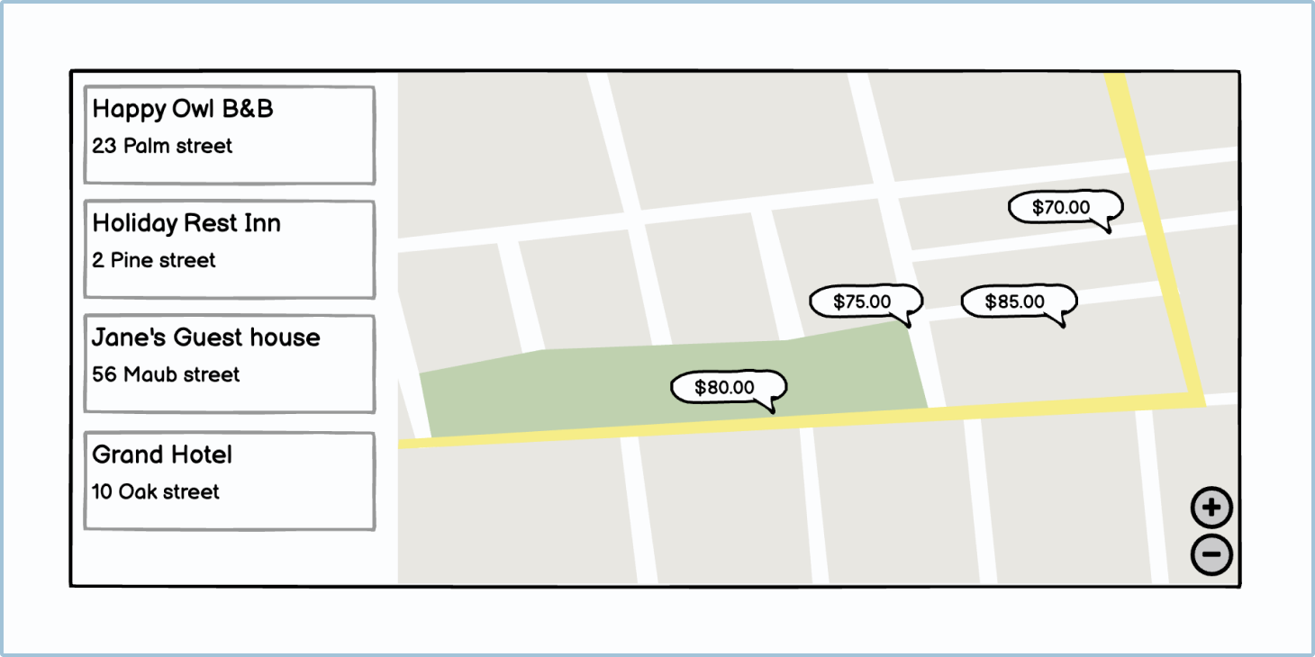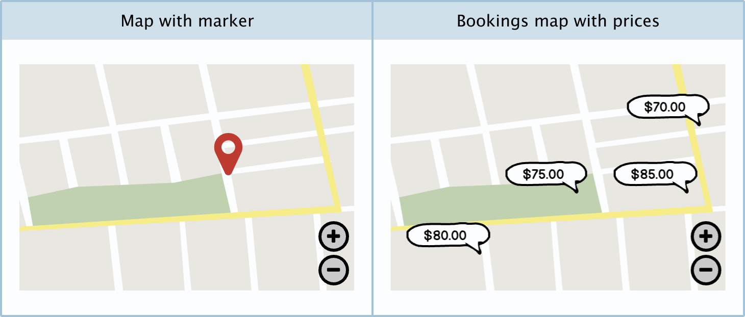 Bookings map with prices: A booking map with prices shows the prices of hotels, accommodation, activities, etc., in a specific area. You can create your own using a map, circle buttons (for zoom controls), and tooltips.