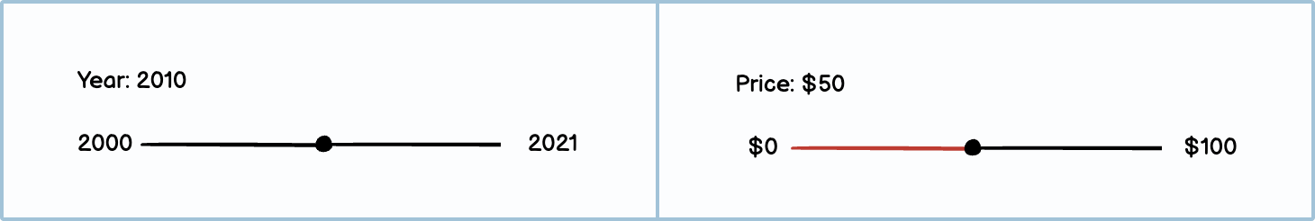 Something to consider is if the user is selecting a specific point or a range. For example, if a user is choosing a year, they’re selecting a single point. However, if a user is refining a search by choosing a maximum price, they’re setting the upper limit of a range (i.e., from zero to the price they have selected). Their search results will include any options up to the maximum price, not merely options at that price. One way to indicate that a slider input is a range rather than a point is to change the color of the first part of the slider bar.