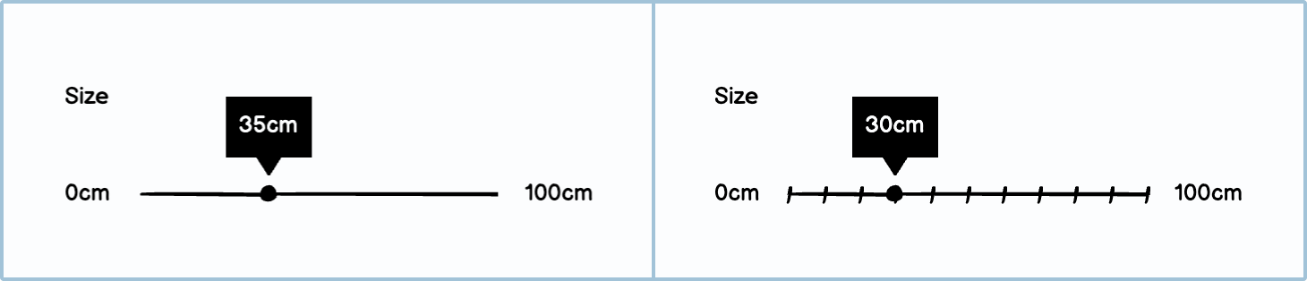When a slider has ticks or intervals, the thumb doesn't drag smoothly across the slider's range; instead, it snaps to the indicated intervals. These intervals mean that there may be fewer options for the user to choose from. In some cases, this limitation may be helpful. Ticks should be used if there are business rules that only allow specific options, while free-drag is better when you do not want to limit the user's choices in this way.
