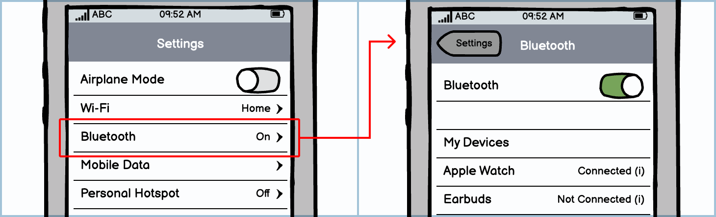 Like the standard submenu link, this type of link will take you to a new screen. However, it has an additional feature: it gives the user a preview of the main setting in the submenu it opens. In the example below, the on/off state of Bluetooth is more important than what is currently connected, so that is what is previewed.