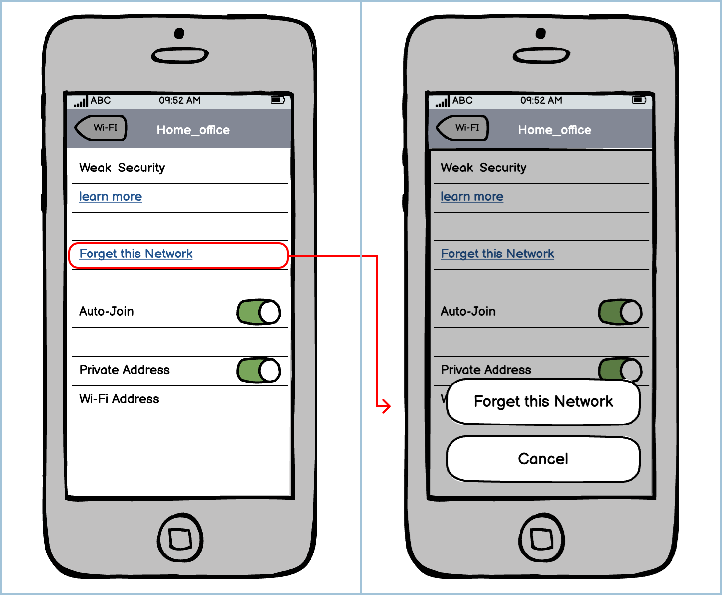For actions that require the system to delete, disconnect, or forget, it’s always advisable to have a confirmation step. When in the context of an iOS menu, it will usually bring up button overlays at the bottom of the screen, with the lowest one being “cancel.”