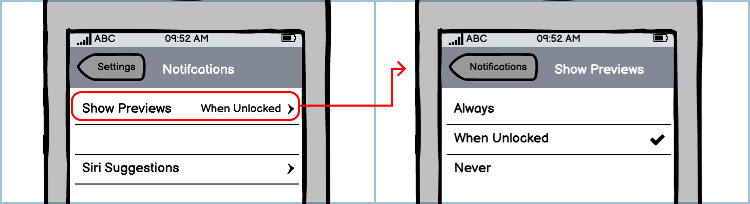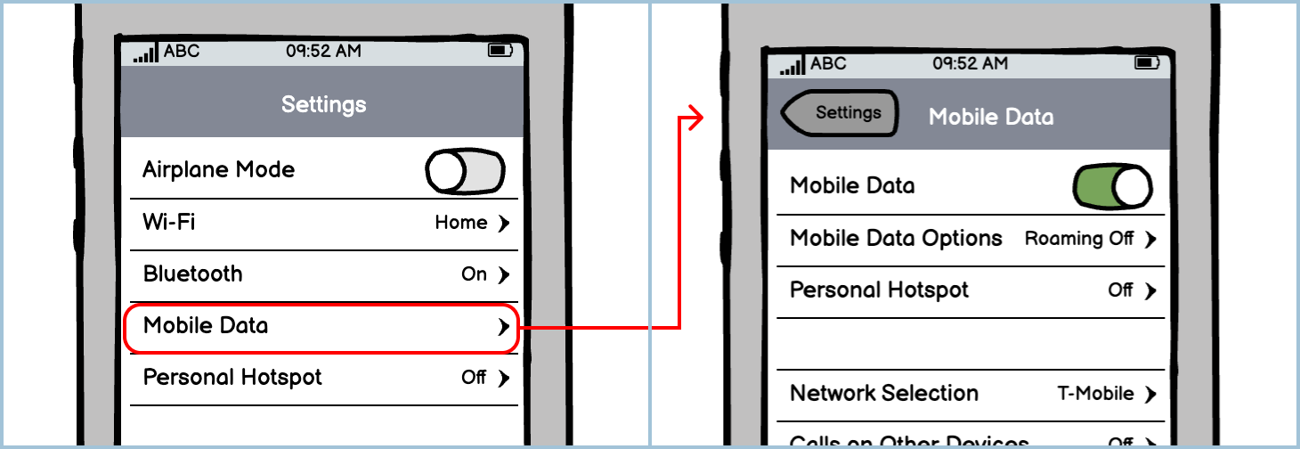 The iOS menu is made up of multiple submenus that allow the user to drill down to what they are looking for. Depending on the type of setting or submenu, they may behave or look differently.